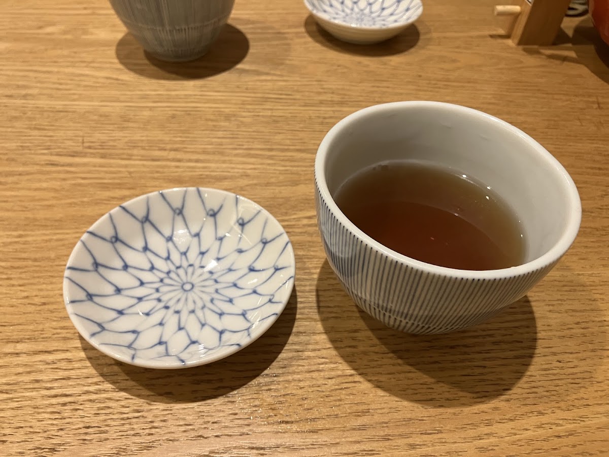 卓上には壺入りのごぼうの甘酢漬けとたくあんが無料で置かれており、天ぷらの合間の箸休めとして機能します。セルフサービスで温かい黒豆茶も用意されており、黒豆の入った独特の風味のお茶は他の天丼店では見かけないサービスです。