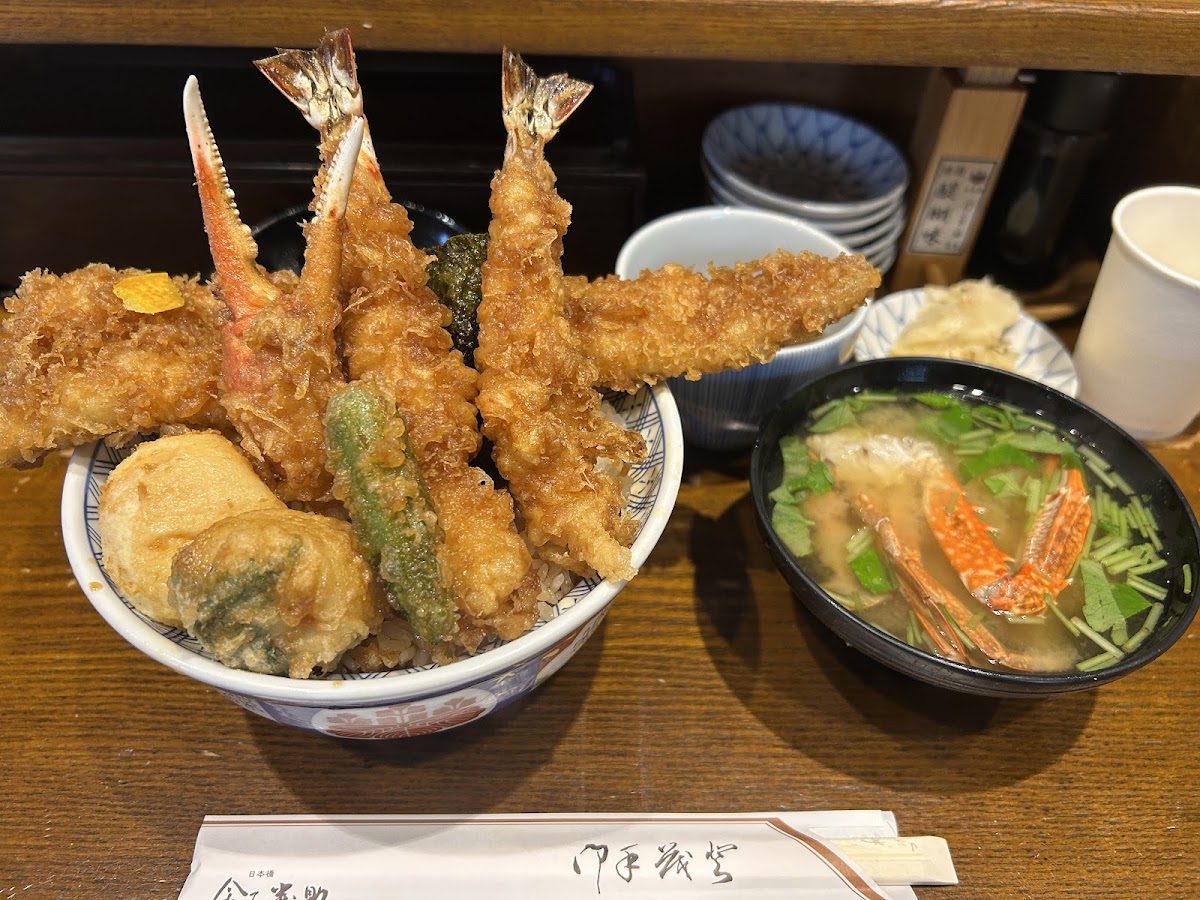 行列中でも、スタッフが外まで注文を聞きに来てくれるため、着席と同時にほどなく天丼が提供されます。回転はゆっくりめながら比較的スムーズに進む仕組みで、ランチの混雑時間帯でも待ち時間の見通しが立てやすい店です。平日は11時、土日祝は10時のオープンで、夜は21時30分(土日は20時30分)まで営業しています。
